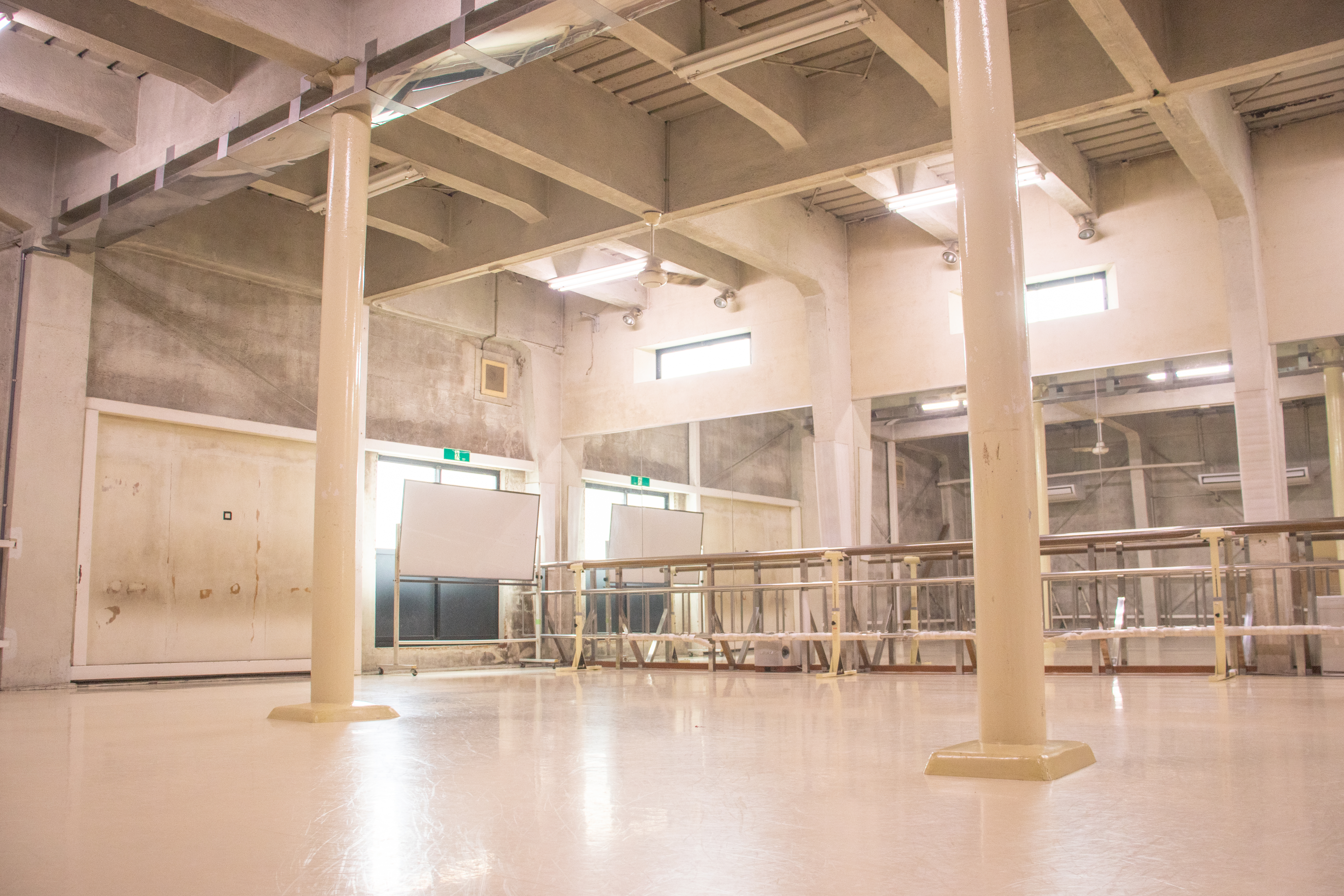 吹き抜けで天井が高く開放的なスタジオでは、舞台上での動きを想定したレッスンがいつでも可能です。